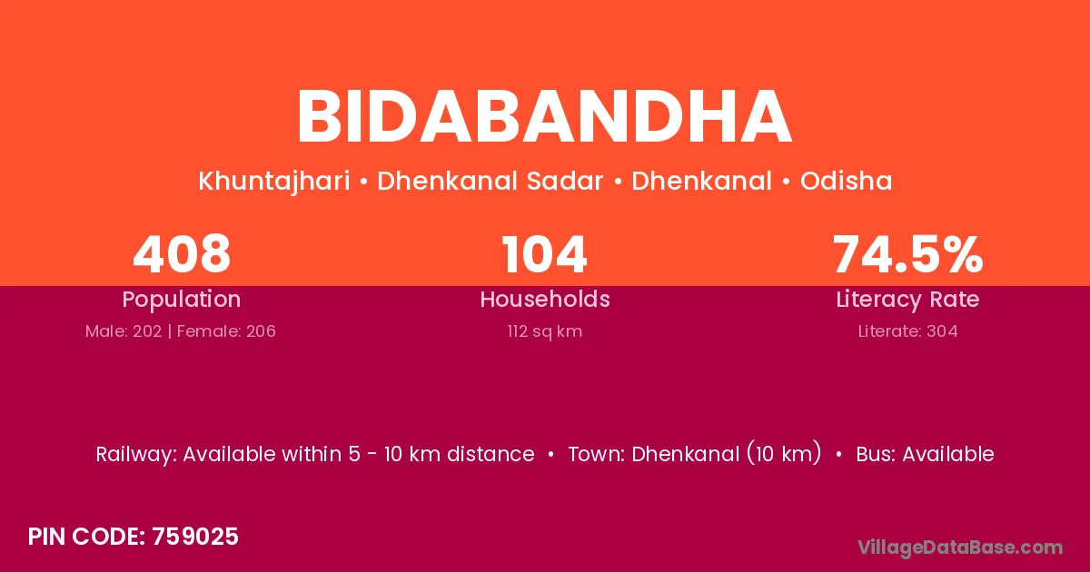 Dhenkanal (10 km) is the nearest town to Bidabandha village for major economic activities and is located approximately 10 km away.