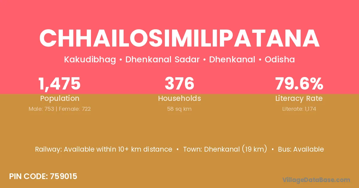 Dhenkanal (19 km) is the nearest town to Chhailosimilipatana village for major economic activities and is located approximately 19 km away.