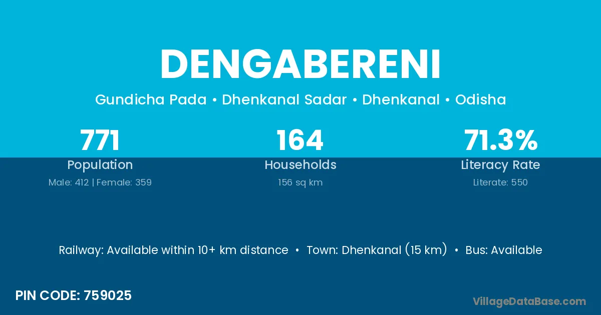 Dhenkanal (15 km) is the nearest town to Dengabereni village for major economic activities and is located approximately 15 km away.