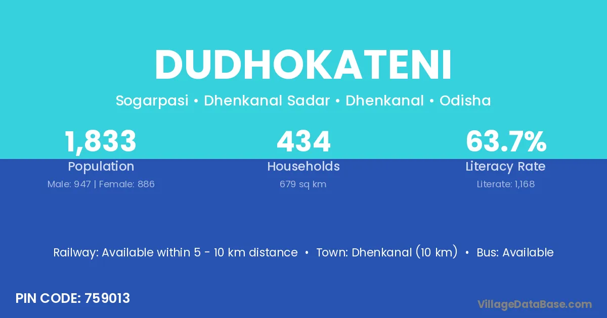 Dhenkanal (10 km) is the nearest town to Dudhokateni village for major economic activities and is located approximately 10 km away.