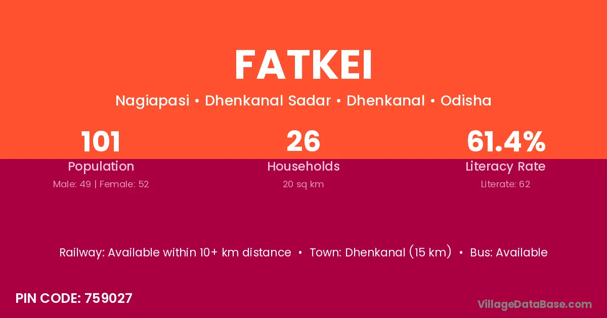 Dhenkanal (15 km) is the nearest town to Fatkei village for major economic activities and is located approximately 15 km away.