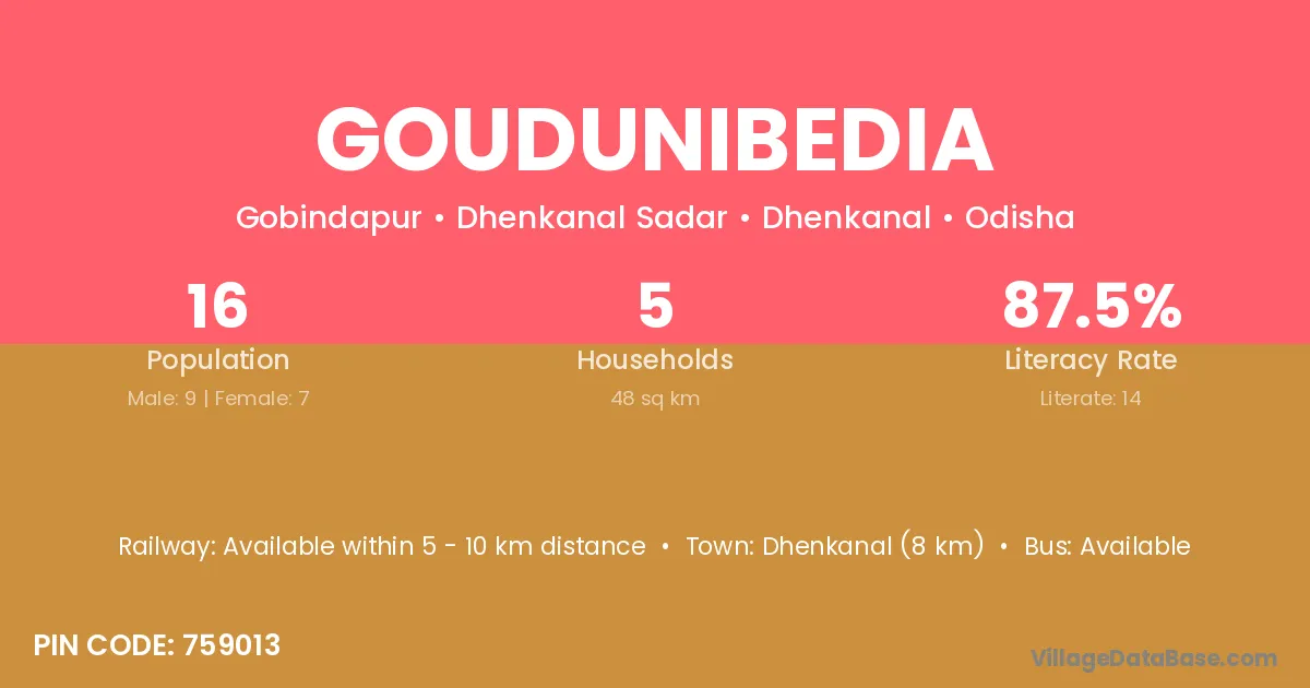Dhenkanal (8 km) is the nearest town to Goudunibedia village for major economic activities and is located approximately 8 km away.