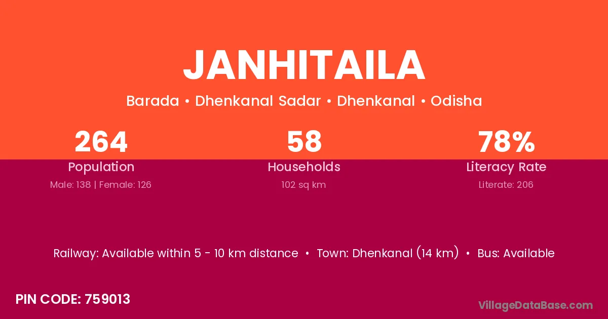 Dhenkanal (14 km) is the nearest town to Janhitaila village for major economic activities and is located approximately 14 km away.