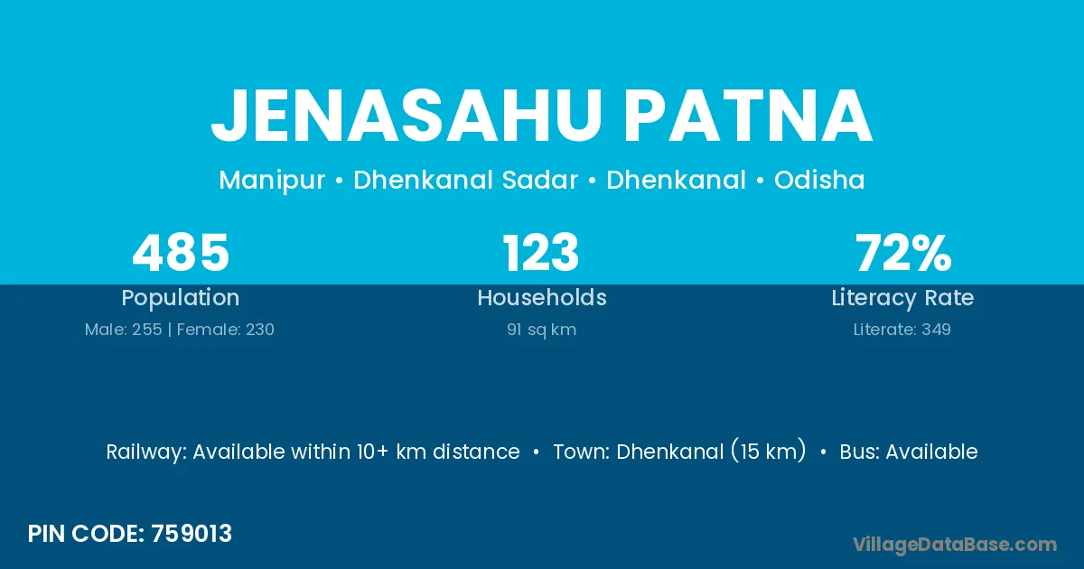 Dhenkanal (15 km) is the nearest town to Jenasahu Patna village for major economic activities and is located approximately 15 km away.