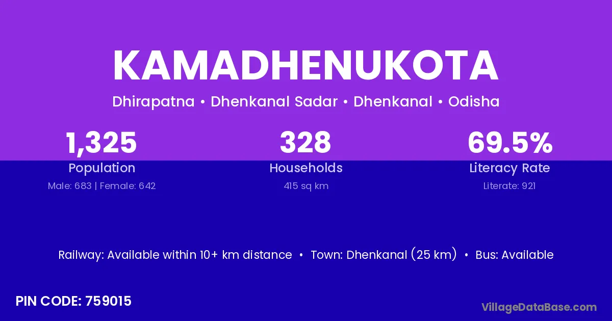 Dhenkanal (25 km) is the nearest town to Kamadhenukota village for major economic activities and is located approximately 25 km away.