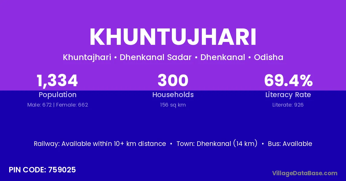 Dhenkanal (14 km) is the nearest town to Khuntujhari village for major economic activities and is located approximately 14 km away.