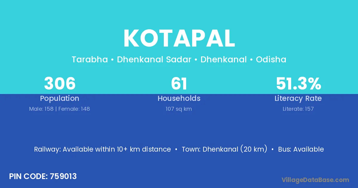 Dhenkanal (20 km) is the nearest town to Kotapal village for major economic activities and is located approximately 20 km away.