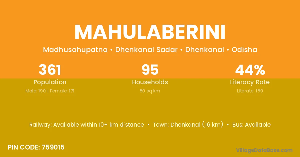 Dhenkanal (16 km) is the nearest town to Mahulaberini village for major economic activities and is located approximately 16 km away.