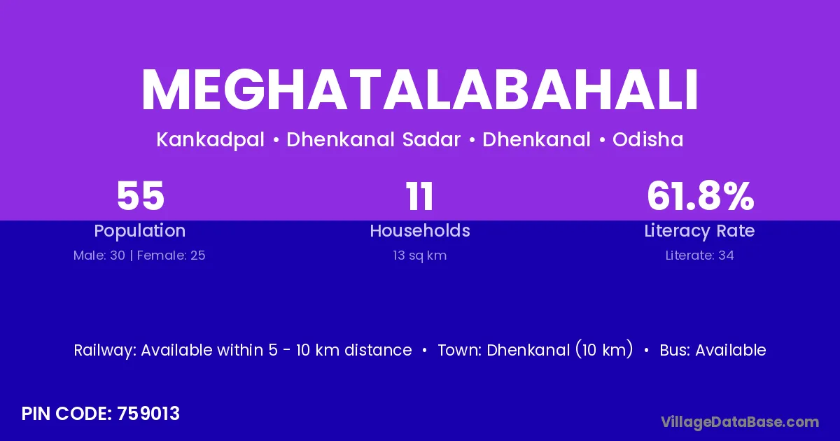 Dhenkanal (10 km) is the nearest town to Meghatalabahali village for major economic activities and is located approximately 10 km away.
