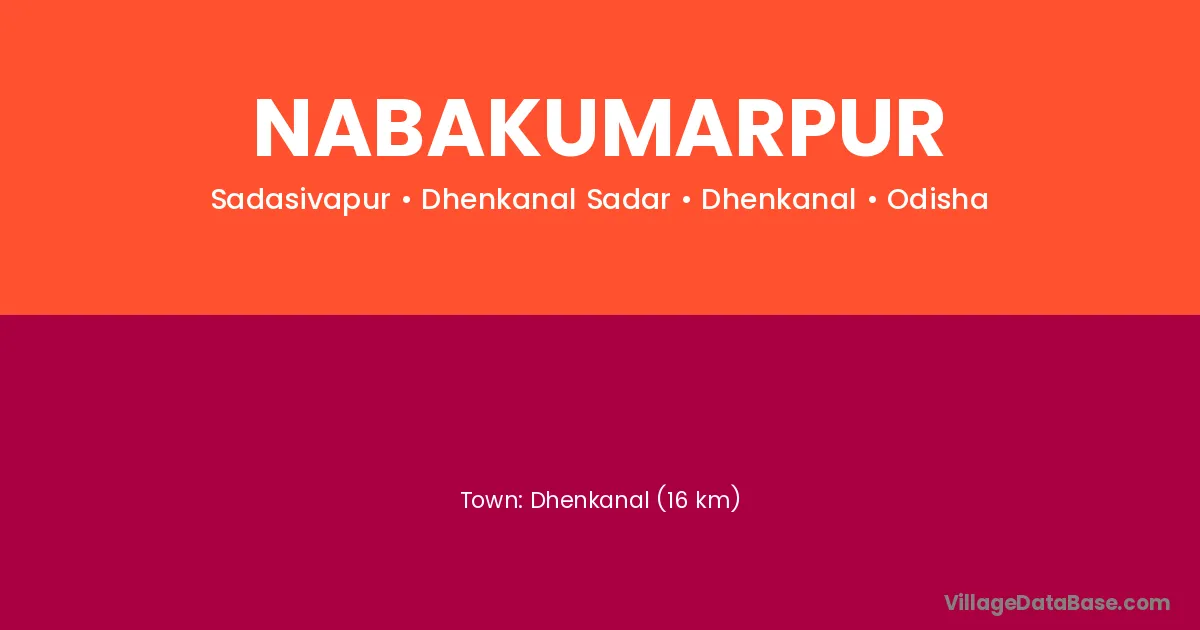 Dhenkanal (16 km) is the nearest town to Nabakumarpur village for major economic activities and is located approximately 16 km away.