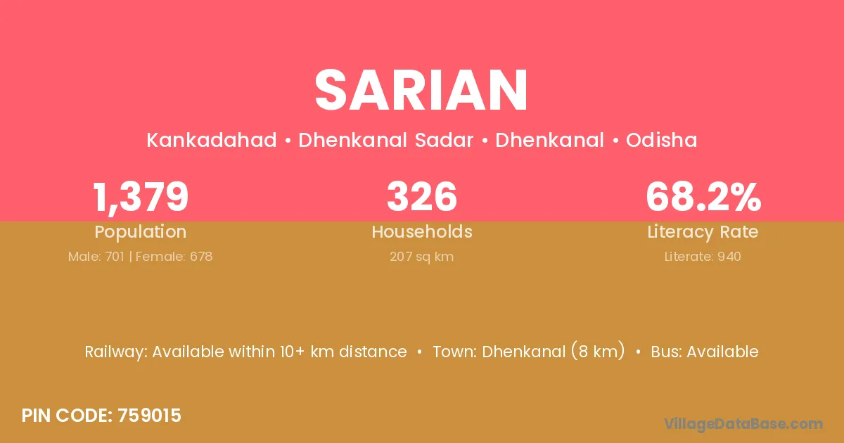 Dhenkanal (8 km) is the nearest town to Sarian village for major economic activities and is located approximately 8 km away.