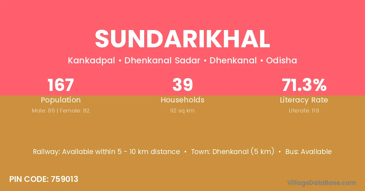 Dhenkanal (5 km) is the nearest town to Sundarikhal village for major economic activities and is located approximately 5 km away.