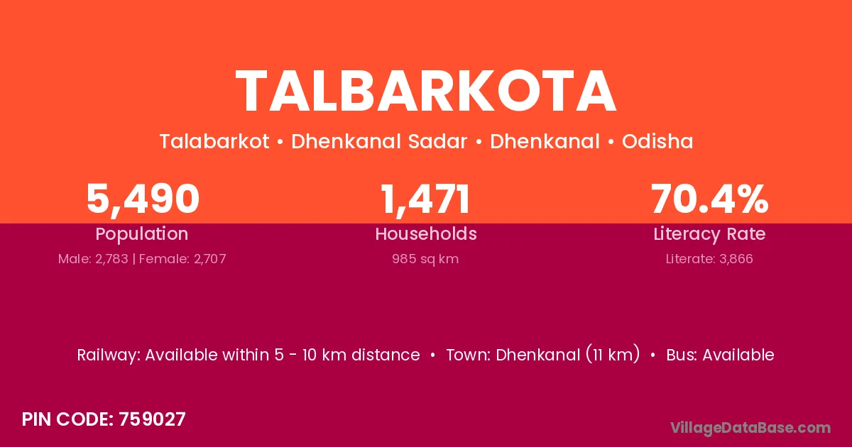 Dhenkanal (11 km) is the nearest town to Talbarkota village for major economic activities and is located approximately 11 km away.