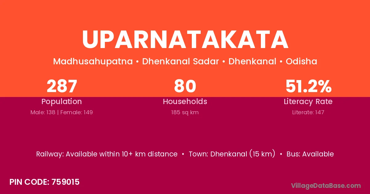 Dhenkanal (15 km) is the nearest town to Uparnatakata village for major economic activities and is located approximately 15 km away.