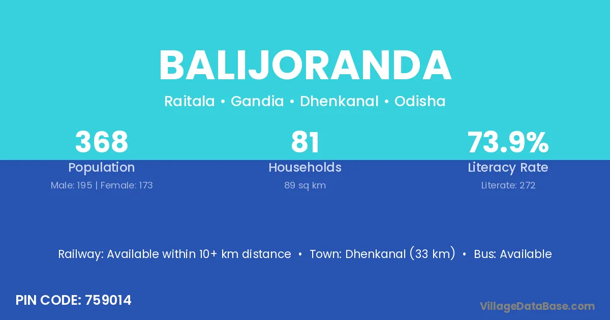 Dhenkanal (33 km) is the nearest town to Balijoranda village for major economic activities and is located approximately 33 km away.