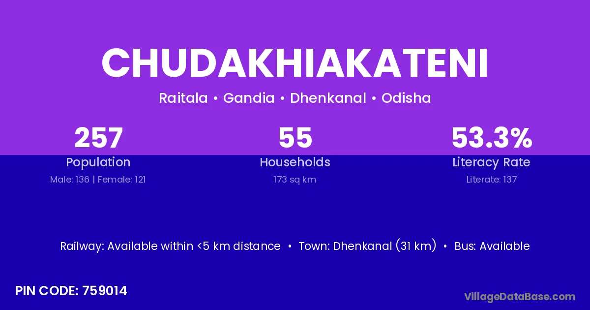 Chudakhiakateni village has a total population of 257 people, of which 136 are males and 121 are females.