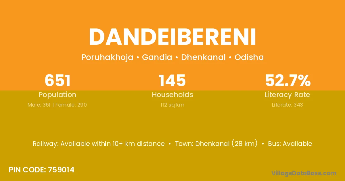 Dhenkanal (28 km) is the nearest town to Dandeibereni village for major economic activities and is located approximately 28 km away.