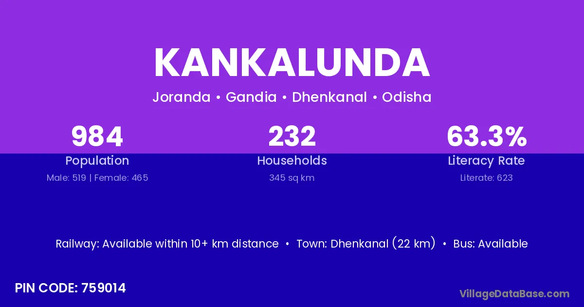 Dhenkanal (22 km) is the nearest town to Kankalunda village for major economic activities and is located approximately 22 km away.