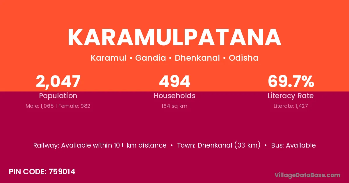 Karamulpatana village has a total population of 2,047 people, of which 1,065 are males and 982 are females.