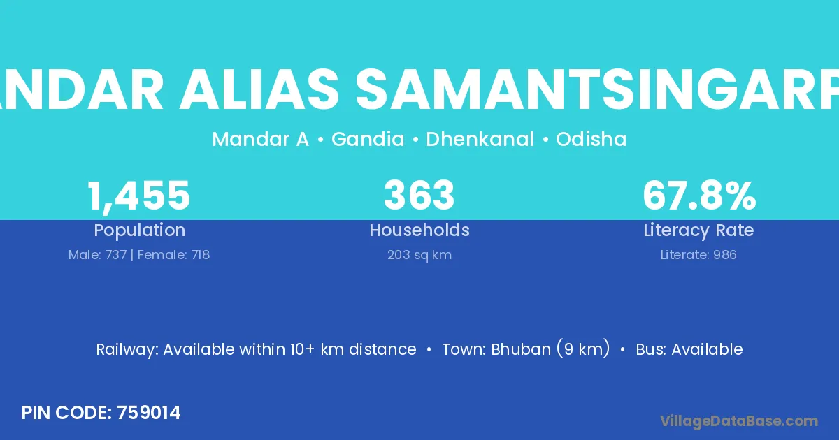 Mandar Alias Samantsingarpur village has a total population of 1,455 people, of which 737 are males and 718 are females.