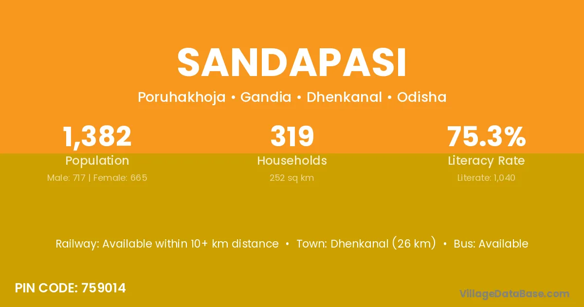 Dhenkanal (26 km) is the nearest town to Sandapasi village for major economic activities and is located approximately 26 km away.
