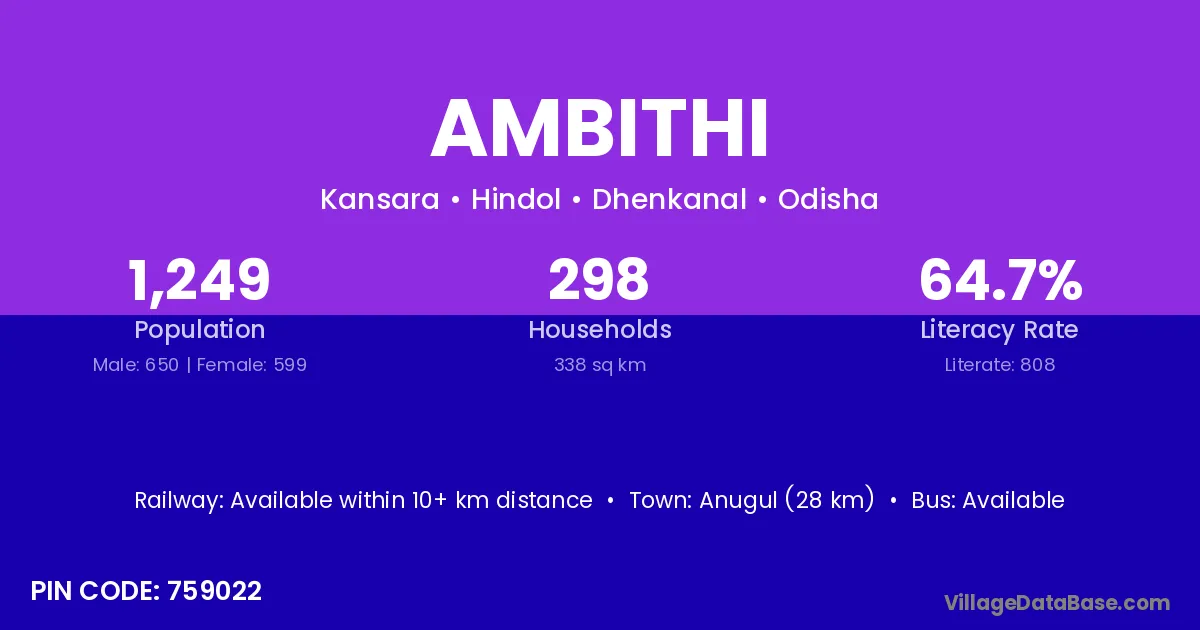 Anugul (28 km) is the nearest town to Ambithi village for major economic activities and is located approximately 28 km away.