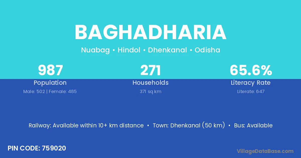 Dhenkanal (50 km) is the nearest town to Baghadharia village for major economic activities and is located approximately 50 km away.