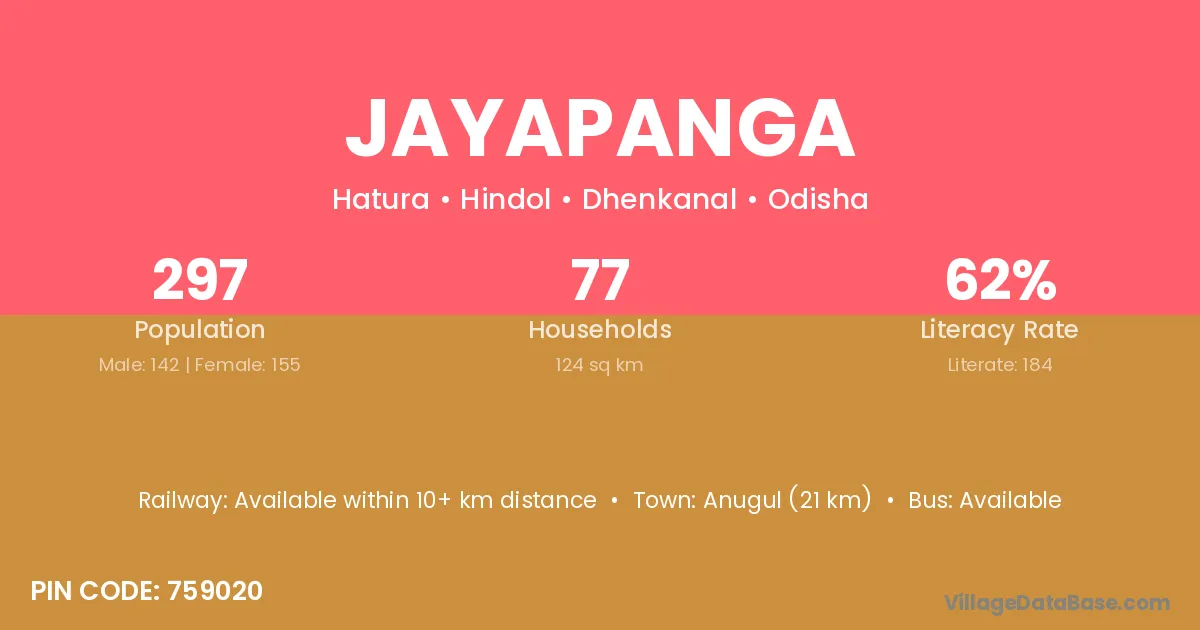 Anugul (21 km) is the nearest town to Jayapanga village for major economic activities and is located approximately 21 km away.