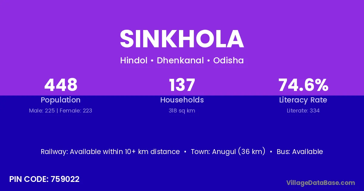 Anugul (36 km) is the nearest town to Sinkhola village for major economic activities and is located approximately 36 km away.