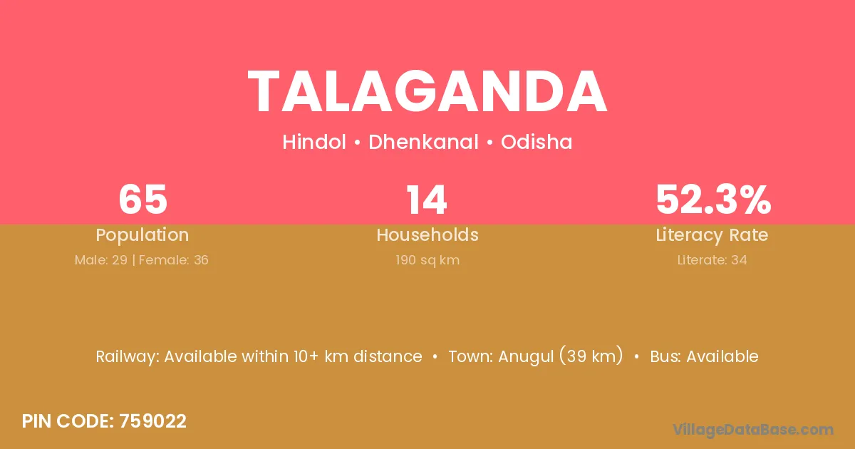 Anugul (39 km) is the nearest town to Talaganda village for major economic activities and is located approximately 39 km away.
