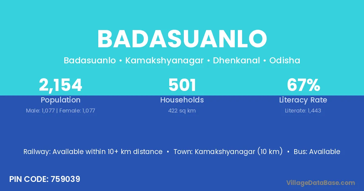 Kamakshyanagar (10 km) is the nearest town to Badasuanlo village for major economic activities and is located approximately 10 km away.
