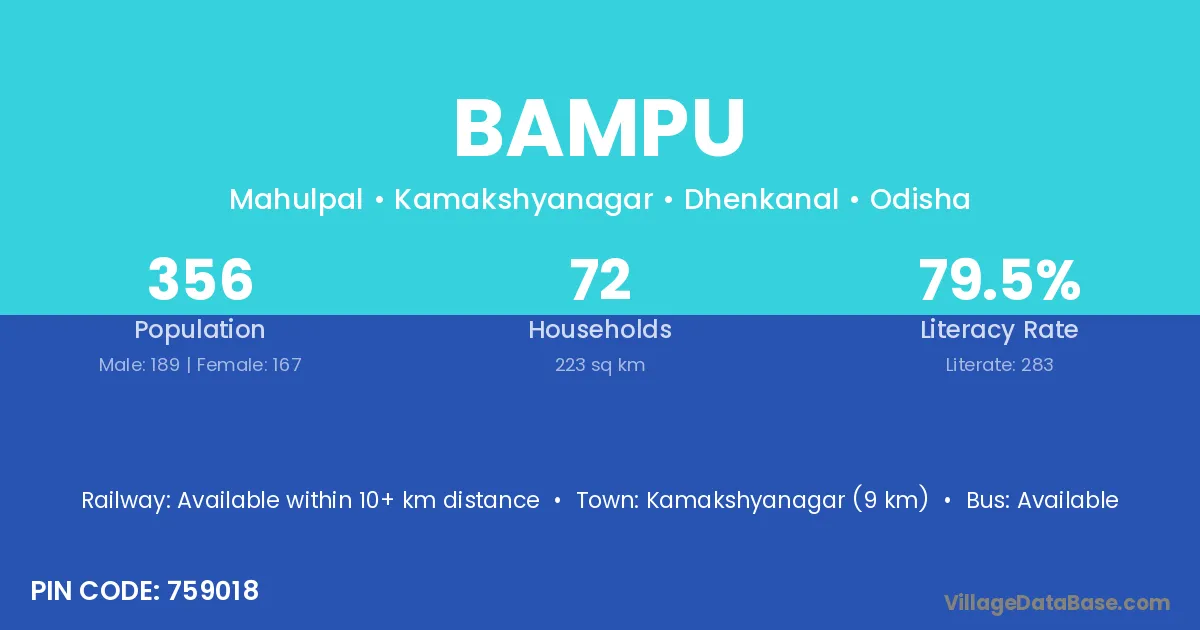 Kamakshyanagar (9 km) is the nearest town to Bampu village for major economic activities and is located approximately 9 km away.