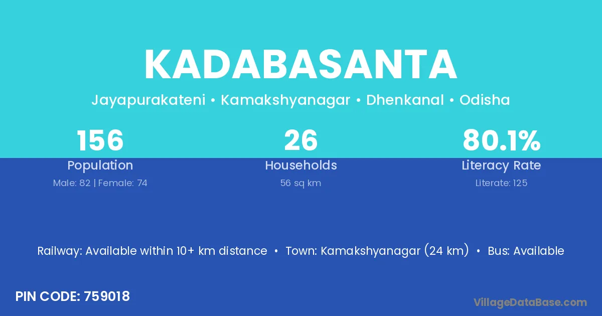 Kamakshyanagar (24 km) is the nearest town to Kadabasanta village for major economic activities and is located approximately 24 km away.