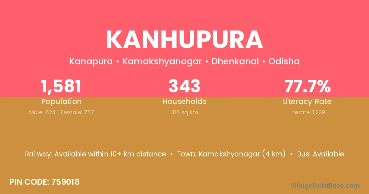 Kamakshyanagar (4 km) is the nearest town to Kanhupura village for major economic activities and is located approximately 4 km away.