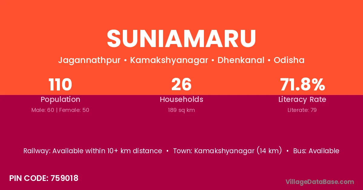 Kamakshyanagar (14 km) is the nearest town to Suniamaru village for major economic activities and is located approximately 14 km away.