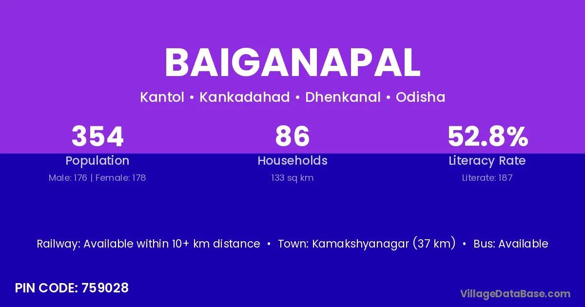 Kamakshyanagar (37 km) is the nearest town to Baiganapal village for major economic activities and is located approximately 37 km away.