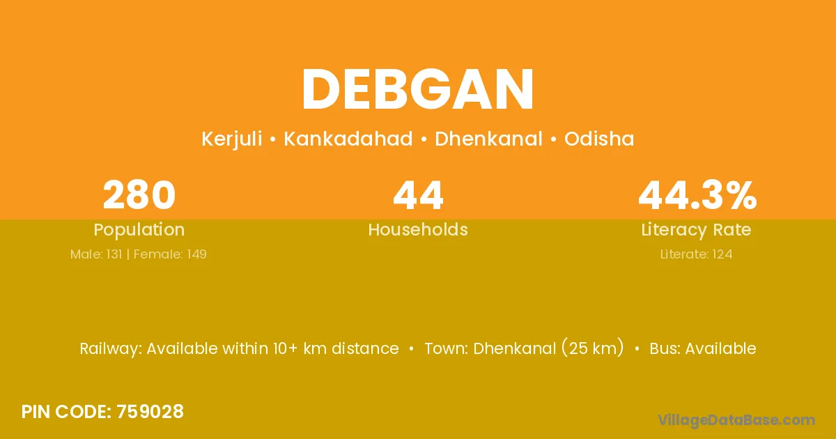 Dhenkanal (25 km) is the nearest town to Debgan village for major economic activities and is located approximately 25 km away.