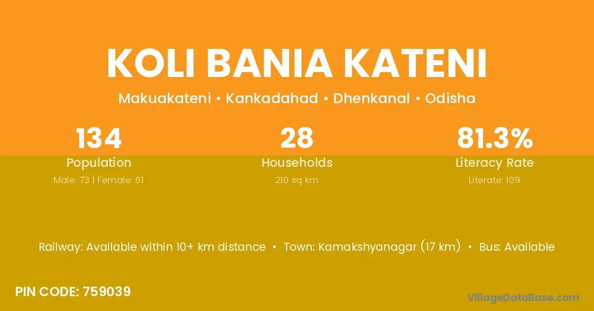 Kamakshyanagar (17 km) is the nearest town to Koli Bania Kateni village for major economic activities and is located approximately 17 km away.