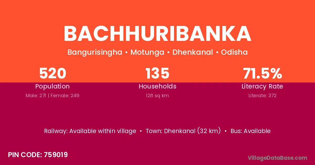Dhenkanal (32 km) is the nearest town to Bachhuribanka village for major economic activities and is located approximately 32 km away.