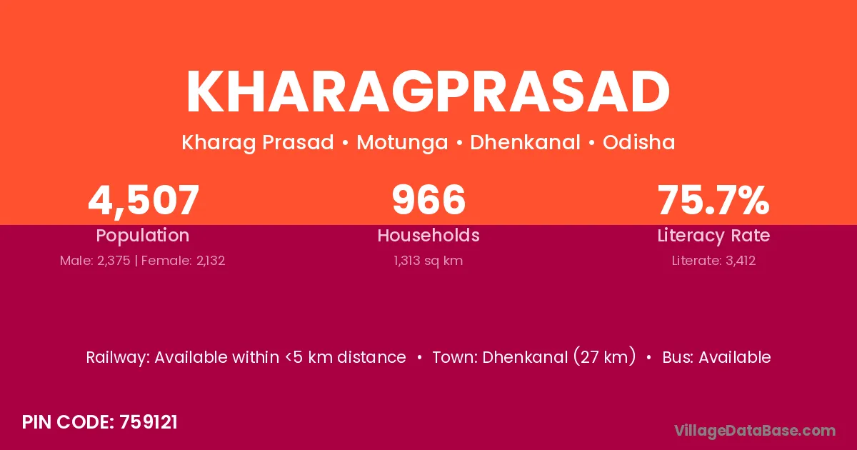 Dhenkanal (27 km) is the nearest town to Kharagprasad village for major economic activities and is located approximately 27 km away.