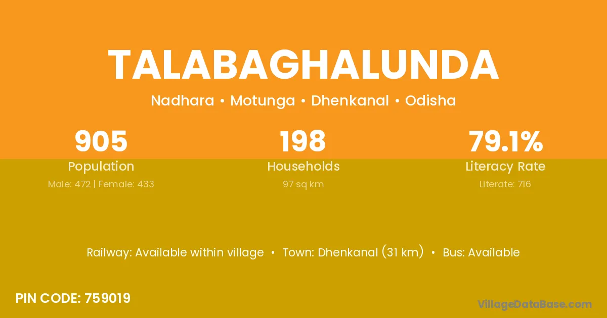 Dhenkanal (31 km) is the nearest town to Talabaghalunda village for major economic activities and is located approximately 31 km away.