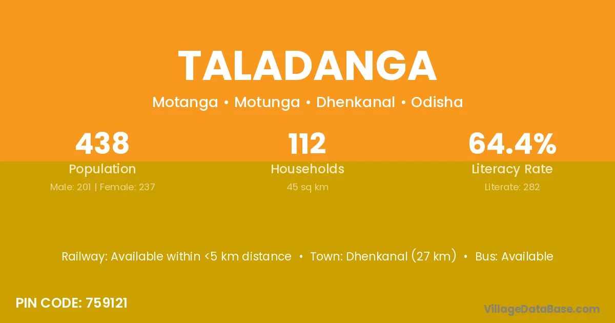 Dhenkanal (27 km) is the nearest town to Taladanga village for major economic activities and is located approximately 27 km away.