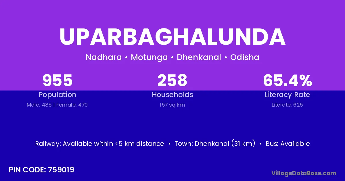 Uparbaghalunda village has a total population of 955 people, of which 485 are males and 470 are females.