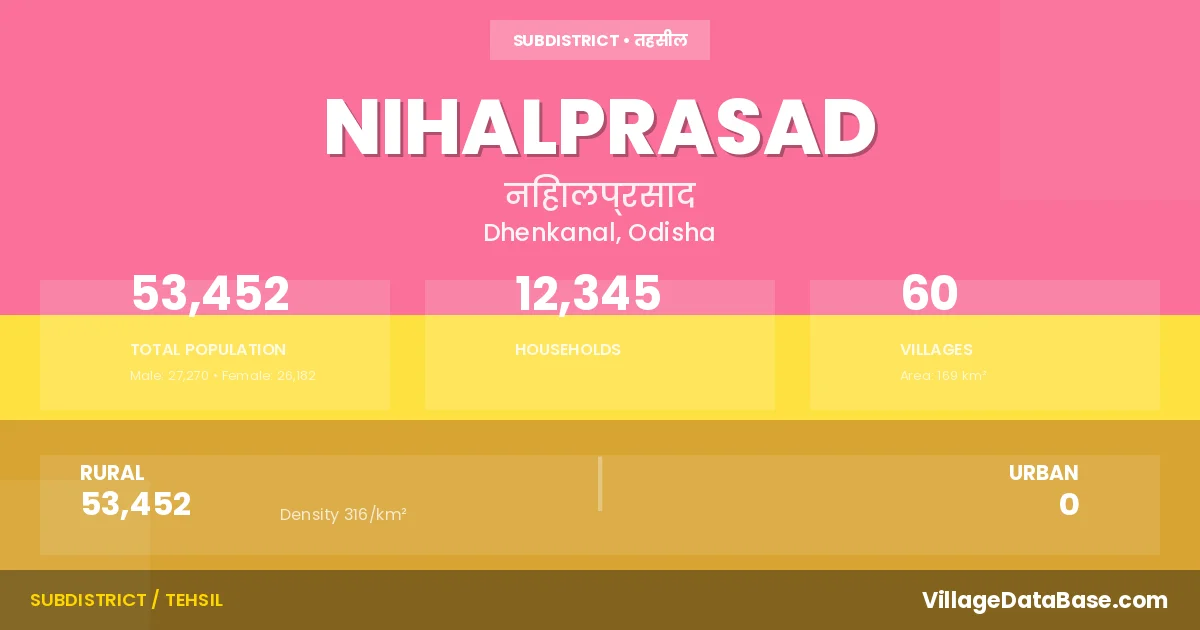 Nihalprasad is a town and Tehsil in the Dhenkanal district of the Odisha. In India, a Tehsil is a subdivision of a district responsible for the administration and revenue collection of a specific area within the district. Tehsils play a crucial role in the local governance structure, contributing significantly to the development and administration of their communities.