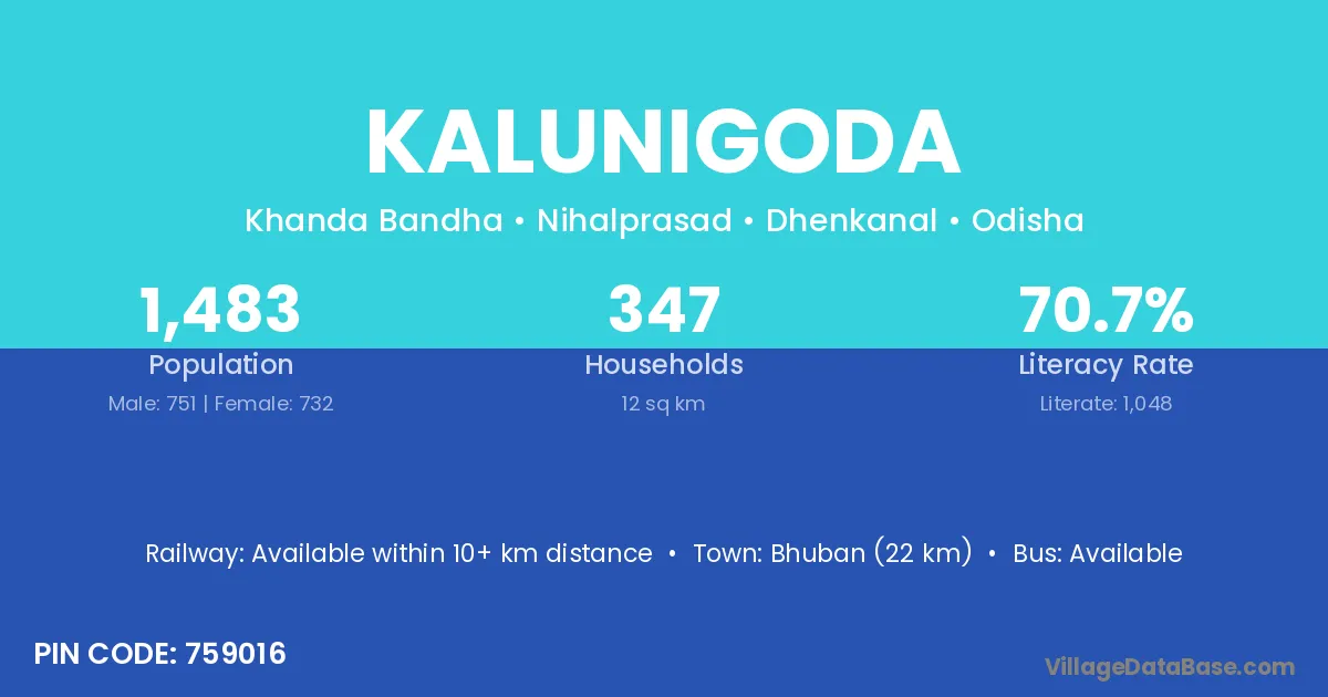 Bhuban (22 km) is the nearest town to Kalunigoda village for major economic activities and is located approximately 22 km away.