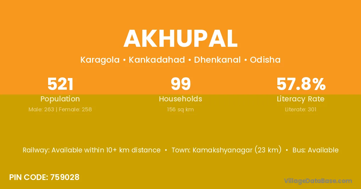 Talcher (22 km) is the nearest town to Akhupal village for major economic activities and is located approximately 22 km away.