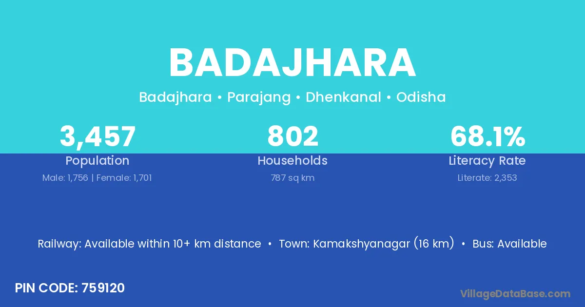 Kamakshyanagar (16 km) is the nearest town to Badajhara village for major economic activities and is located approximately 16 km away.