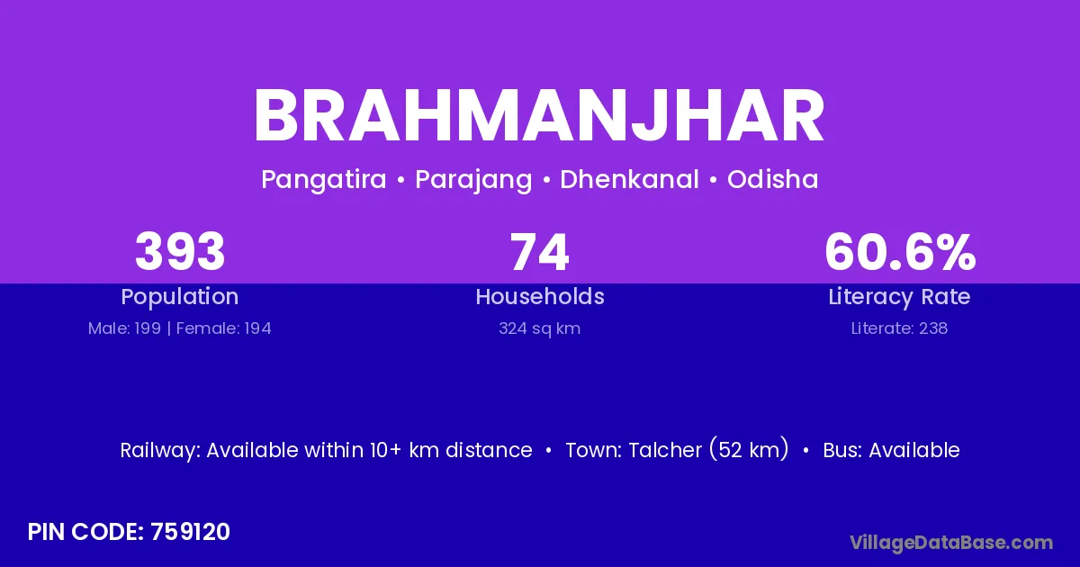 Brahmanjhar village has a total population of 393 people, of which 199 are males and 194 are females.