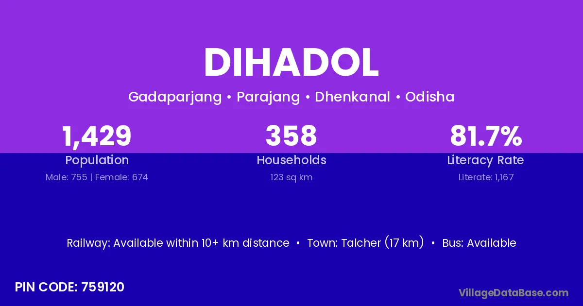 Talcher (17 km) is the nearest town to Dihadol village for major economic activities and is located approximately 17 km away.