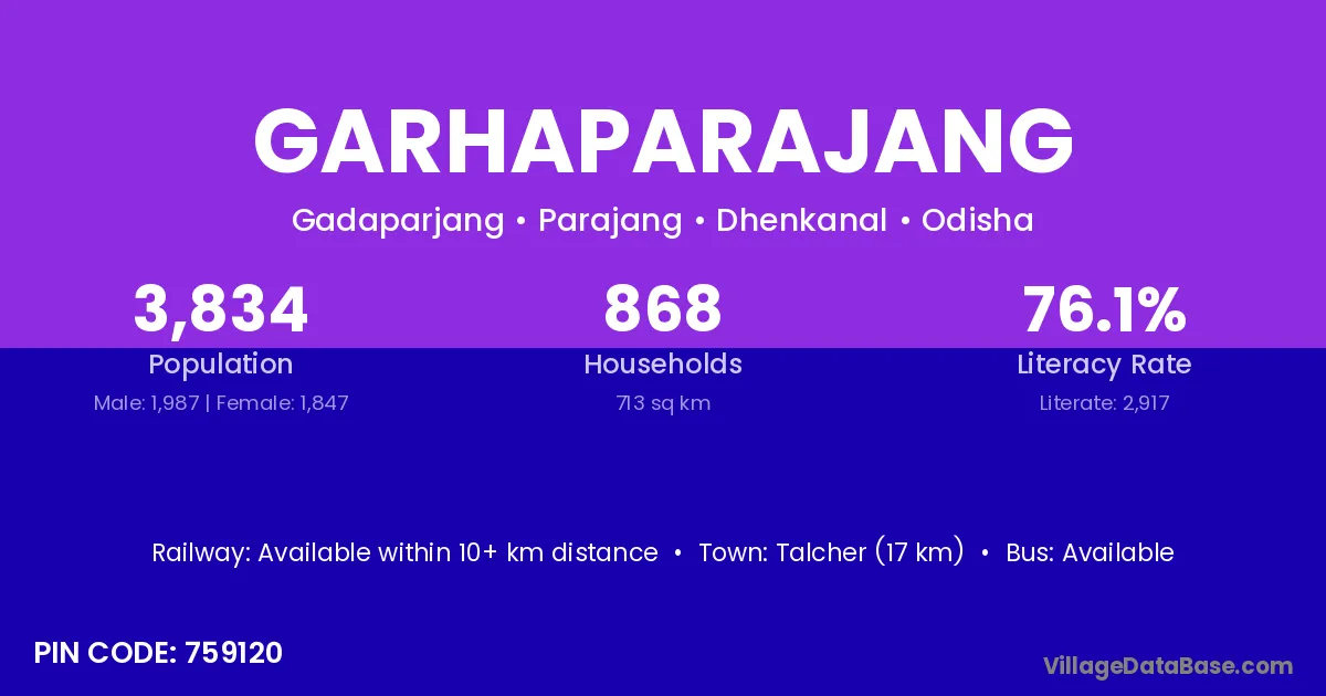 Talcher (17 km) is the nearest town to Garhaparajang village for major economic activities and is located approximately 17 km away.